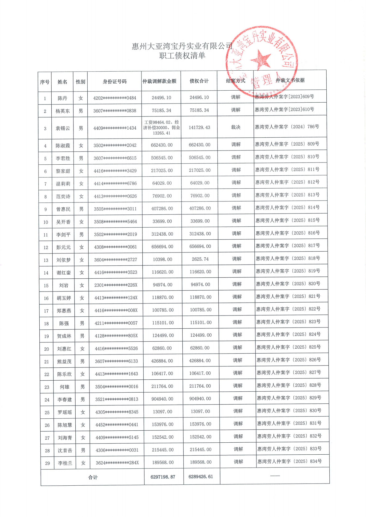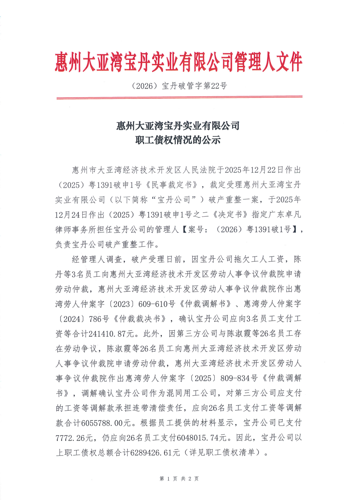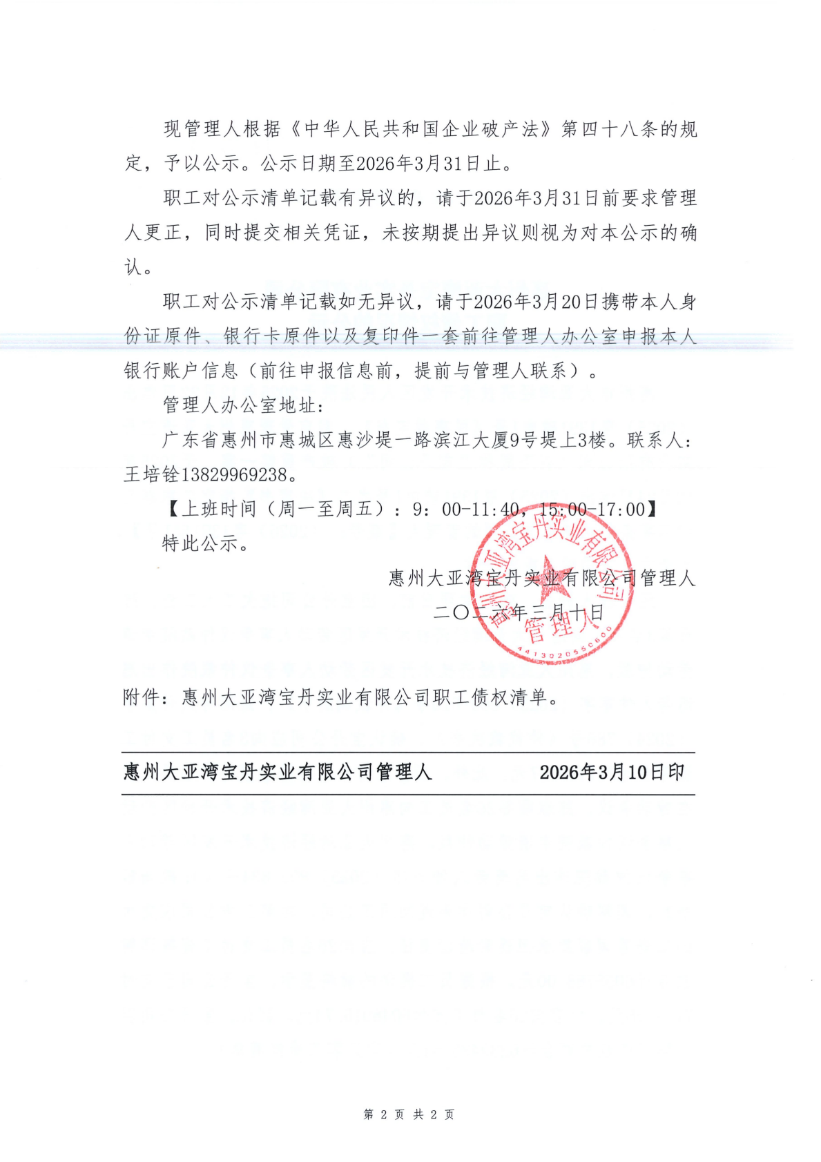 关于惠州大亚湾宝丹实业有限公司职工债权情况的公示